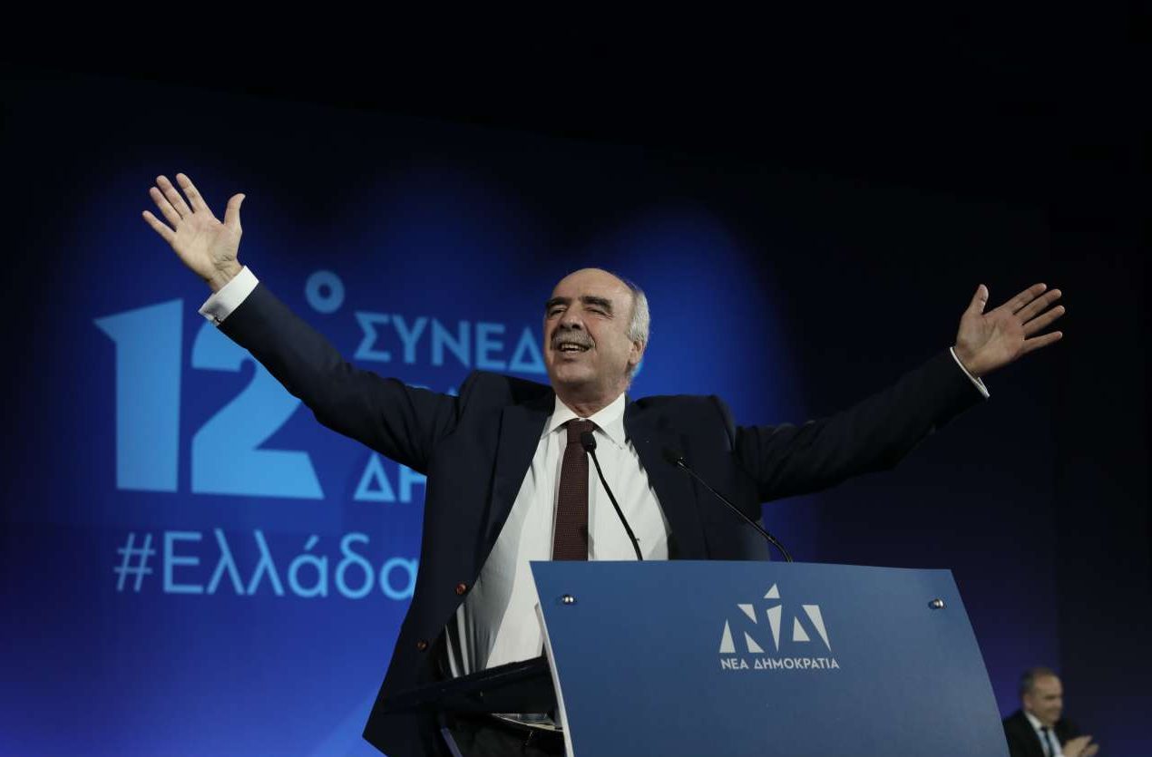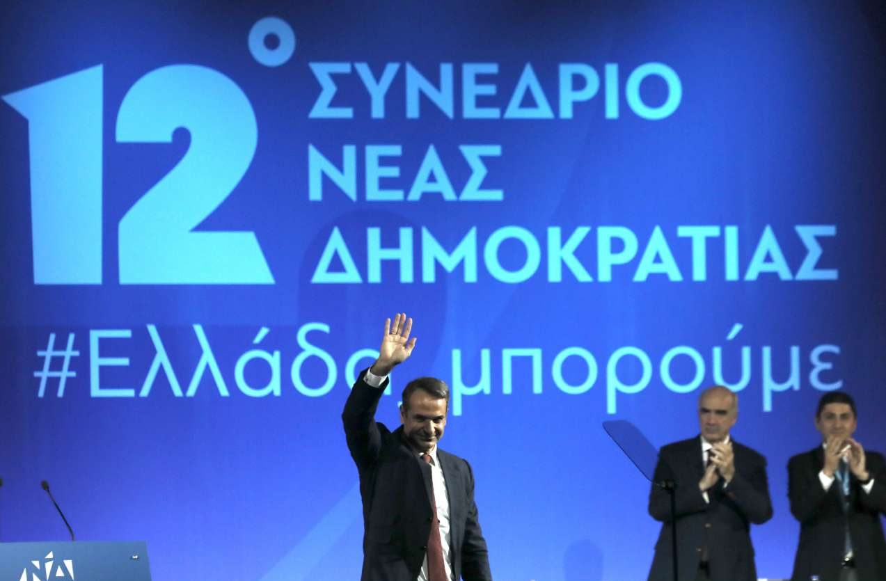 O Kυριάκος Μητσοτάκης χαιρετά τους συνέδρους με το σύνθημα του #Eλλάδα Μπορούμε να δεσπόζει πίσω του. Στο βάθος δεξιά, οι Βαγγέλης Μεϊμαράκης και Λευτέρης Αυγενάκης