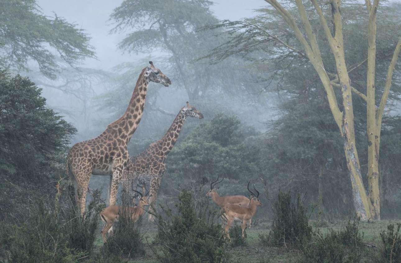 «Ματιά στην Αγρια Φύση». Δύο καμηλοπάρδαλεις και τρεις αφρικανικές αντιλόπες μέσα στη βροχή στο Εθνικό Πάρκο του Ναϊρόμπι, στην Κένυα, όπου φιλοξενούνται επίσης και λιοντάρια. Σύμφωνα με τον φωτογράφο είναι αμυντικός μηχανισμός για διαφορετικά είδη θηραμάτων να μένουν μαζί προκειμένου να προστατευτούν από ελλοχεύοντες θηρευτές