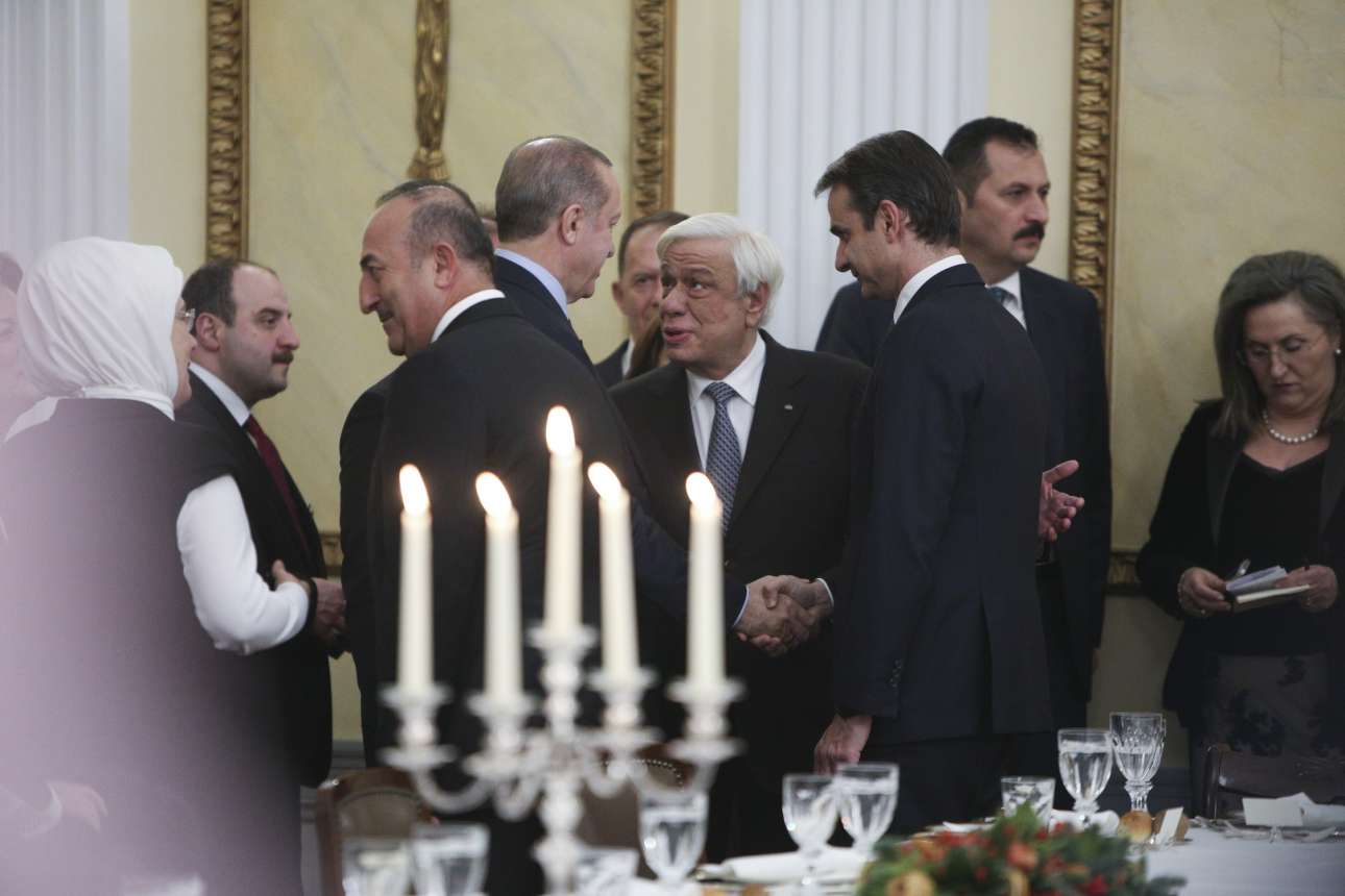 Ο Ερντογάν ανταλλάσσει χειραψία με τον πρόεδρο της Νέας Δημοκρατίας Κυριάκο Μητσοτάκη, παρουσία του Προκόπη Παυλόπουλου