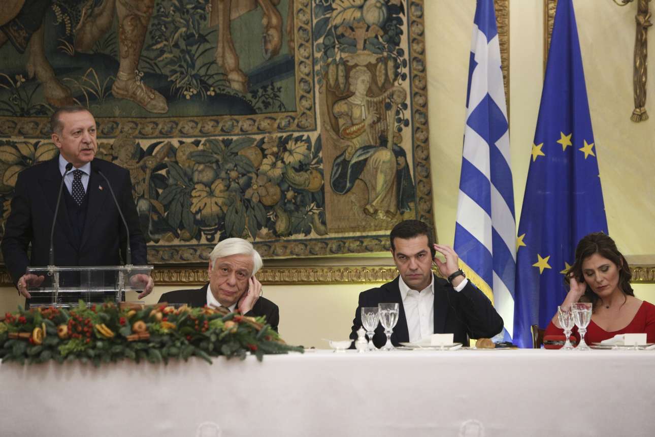 Μια διαφορετική εικόνα απ' όσα είχαν γίνει το μεσημέρι. Ερντογάν και Παυλόπουλος σε πιο χαλαρό ύφος γιαι το δείπνο. Δεξιά οι δύο Πρώτες Κυρίες