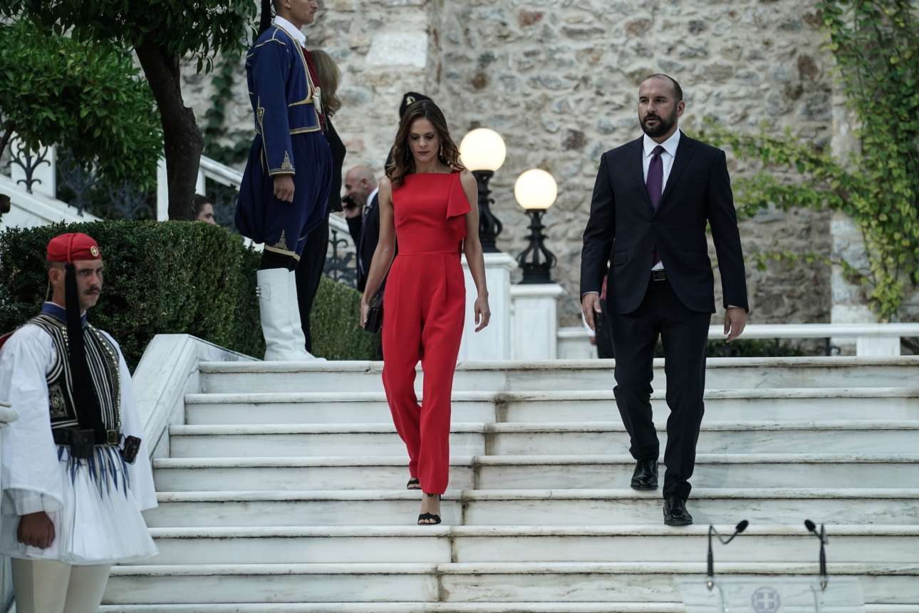 Ζευγάρι στη ζωή και στο κόμμα, η βουλευτής Επικρατείας και τομεάρχης Εργασίας του ΣΥΡΙΖΑ, Εφη Αχτσιόγλου καταφθάνει στη δεξίωση με τον κοινοβουλευτικό εκπρόσωπο της αξιωματικής αντιπολίτευσης Δημήτρη Τζανακόπουλο