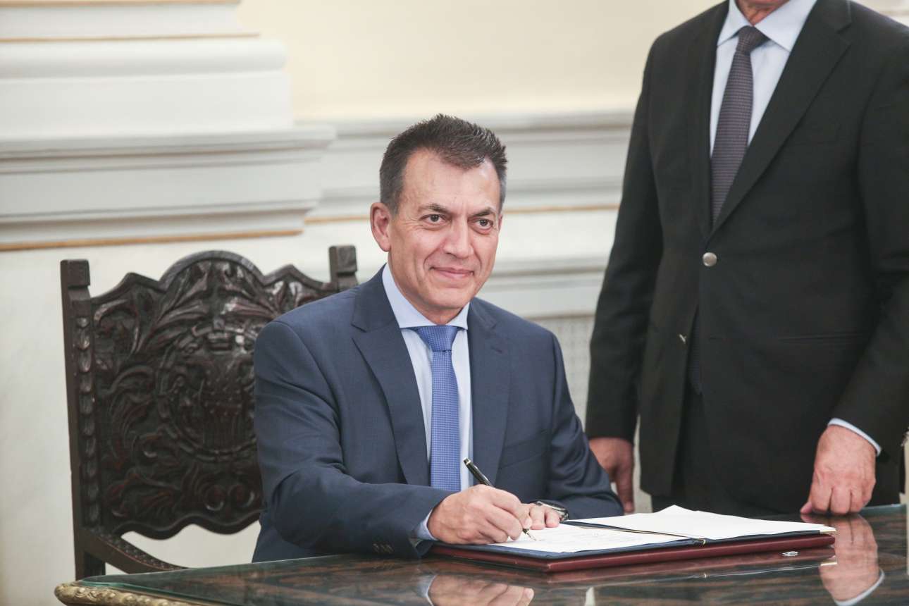 Ο Γιάννης Βρούτσης υπογράφει το πρωτόκολλο ως νέος υπουργός Εργασίας και Κοινωνικών Υποθέσεων.