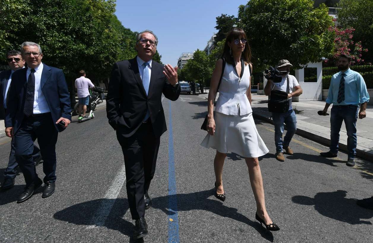 O νέος υπουργός Ενέργειας Κωστής Χατζηδάκης κατηφορίζει την Ηρώδου Αττικού με τη σύζυγό του, λίγο πριν την τελετή ορκωμοσίας της κυβέρνησης Μητσοτάκη