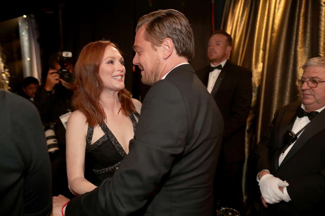 Μετά τη βράβευση, στα παρασκήνια. Η Τζούλιαν Μουρ συγχαίρει και από κοντά τον Λεονάρντο ντι Κάπριο