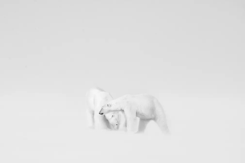 Πρώτη θέση στην κατηγορία «Άσπρο-Μαύρο» η φωτογραφία δύο πολικών αρκούδων που μετά βίας ξεχωρίζουν μέσα στο απόλυτο λευκό τοπίο