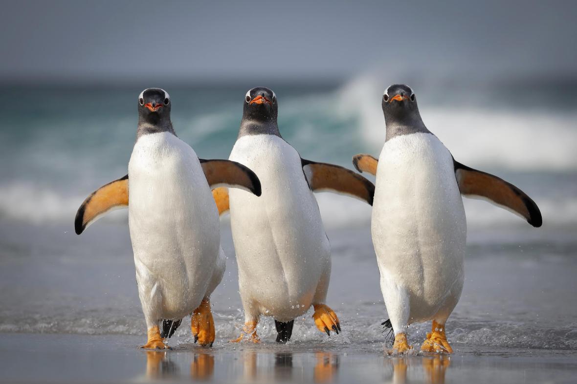 Παρέα πιγκουΐνων στα νησιά Φόκλαντ ποζάρει στον φωτογραφικό φακό με μια συντονισμένη κίνηση που μοιάζει με χορευτική φιγούρα