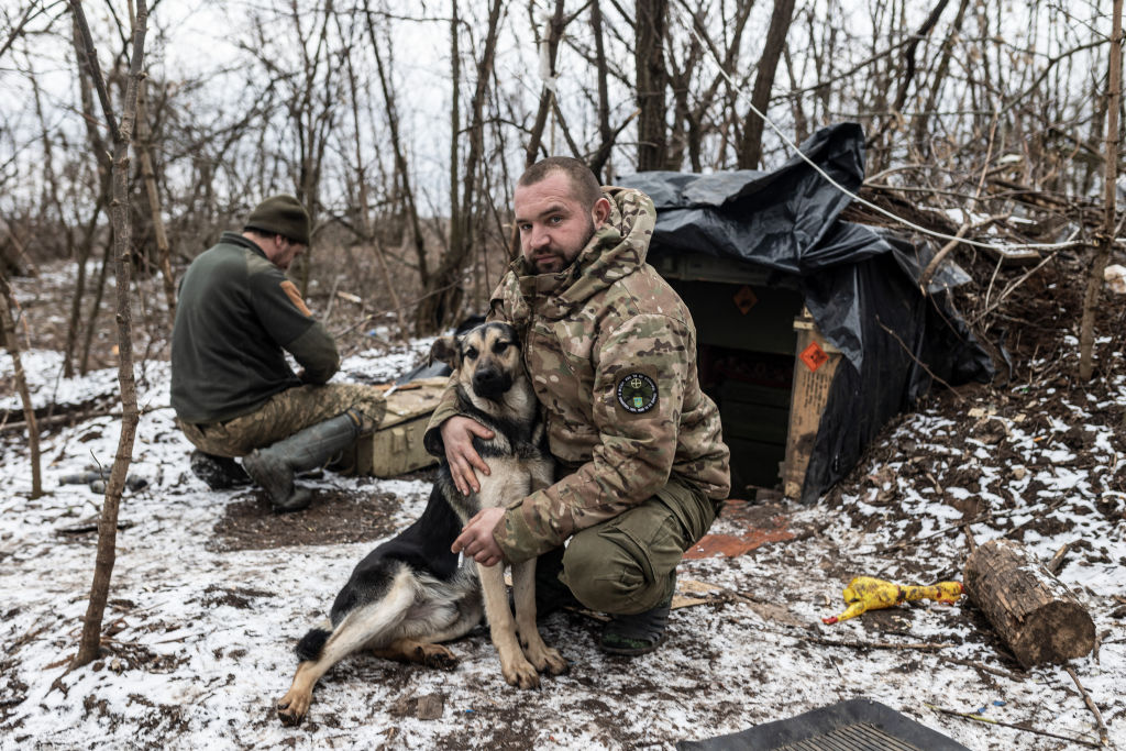 Ουκρανός στρατιώτης φωτογραφήθηκε με τον σκύλο του στην ανάπαυλα της μάχης, κοντά στο Μπαχμούτ, στις 20 Φεβρουαρίου 2024 – τρυφερή στιγμή, παρένθεση στη βία