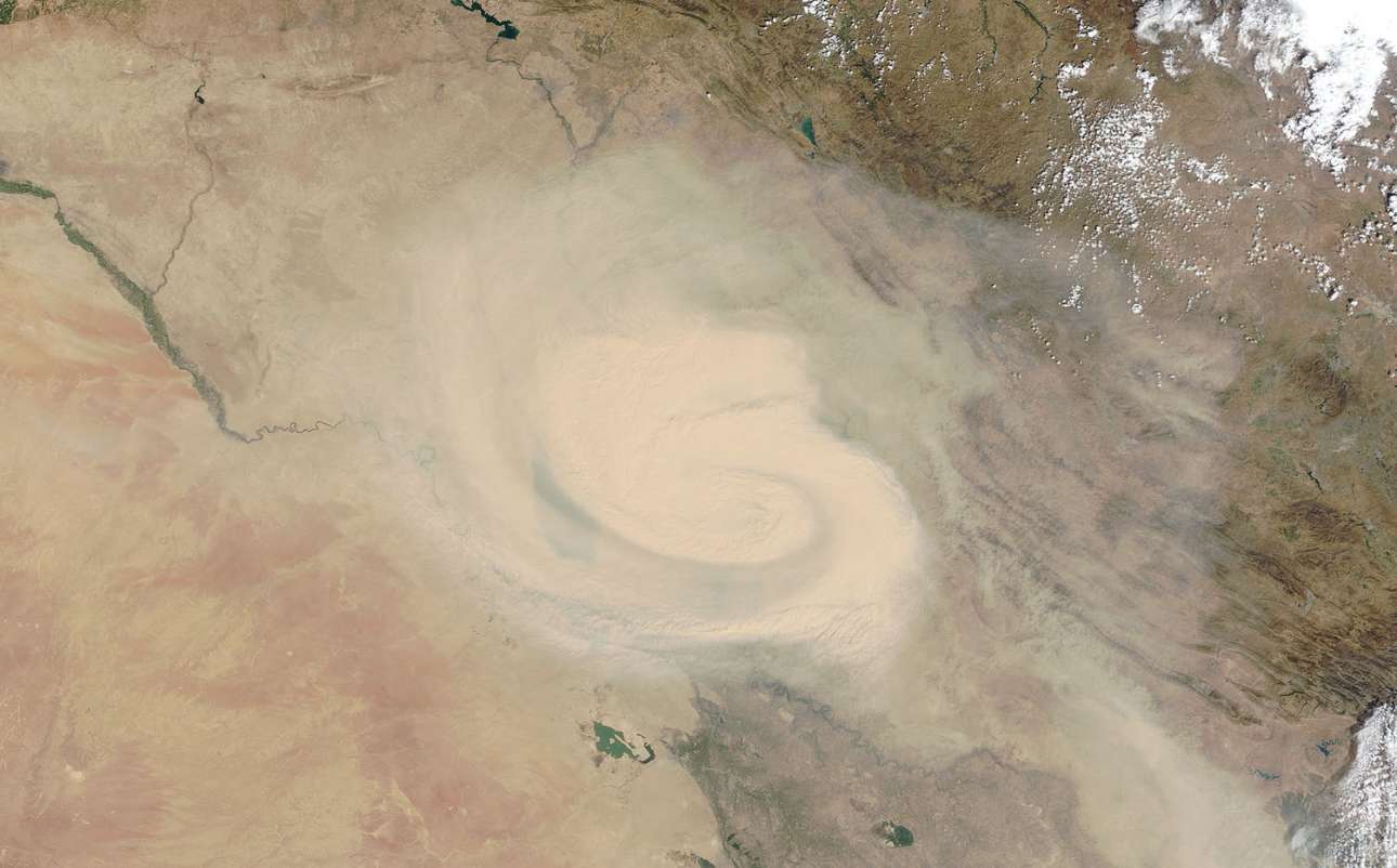 Θύελλα σκόνης και άμμου που μετακινείται πάνω από το Ιράν, το Ιράκ και την περιοχή του Περσικού Κόλπου, όπως φαίνεται από δορυφόρο της NASA