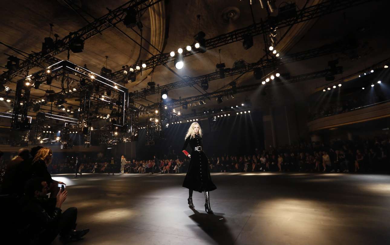 Ολα τα φώτα είναι στραμμένα στην σκηνή όπου ένα μοντέλο παρουσιάζει μια δημιουργία του οίκου Υβ Σεν Λοράν