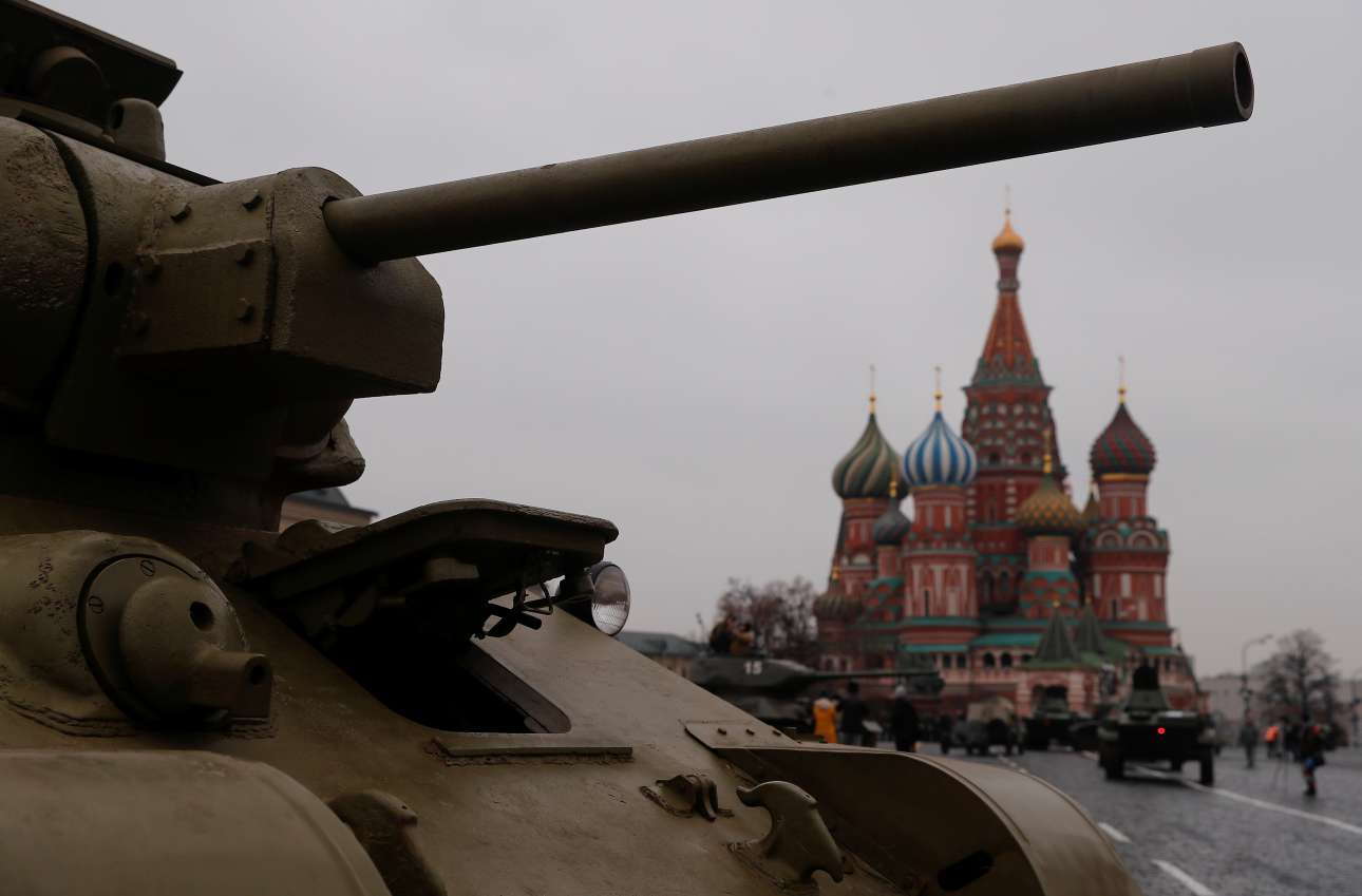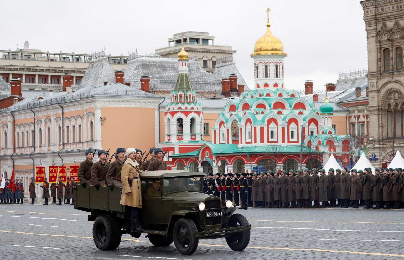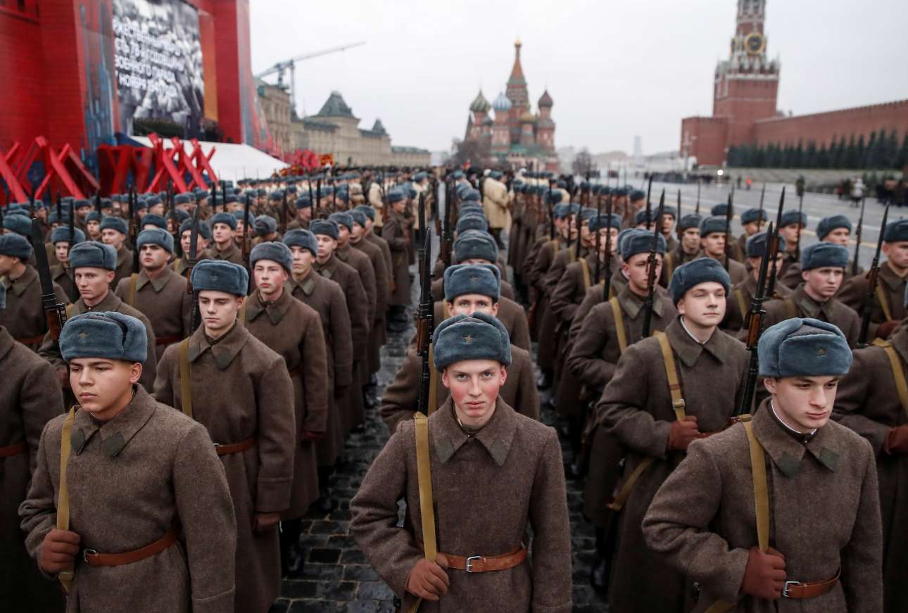 Χιλιάδες ρώσοι στρατιώτες παρήλασαν στην Κόκκινη Πλατείας της Μόσχας, σε μία ιδιαίτερη εκδήλωση που έγινε την Πέμπτη προς τιμήν της 78ης επετείου της ιστορικής παρέλασης του Β’ Παγκοσμίου Πολέμου. Τον Νοέμβριο του 1941 οι γερμανικές δυνάμεις προσπάθησαν να καταλάβουν τη Μόσχα, ενώ η γραμμή του μετώπου σε μερικά σημεία βρισκόταν σε απόσταση μόλις 30 χιλιομέτρων από τη ρωσική πρωτεύουσα. Τότε, στην Κόκκινη Πλατεία έγινε η παρέλαση του Κόκκινου Στρατού στην οποία συμμετείχαν 28.400 στρατιώτες που κατευθύνθηκαν προς τη γραμμή του μετώπου για να αποτρέψουν την προέλαση του εχθρού
