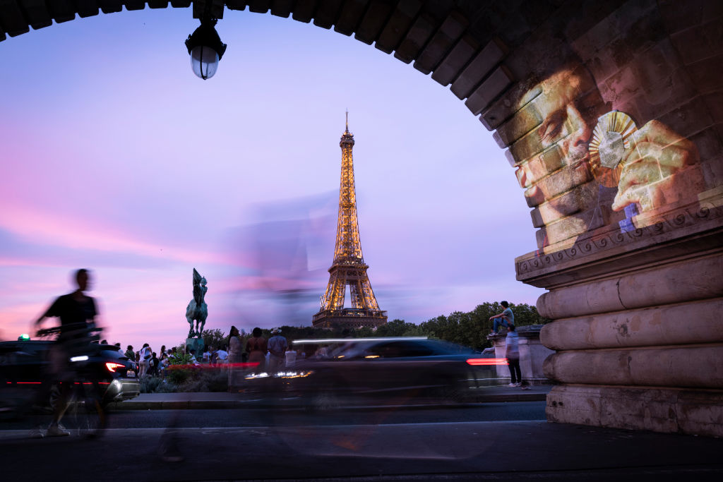 Φωτογραφία της χρυσής Ολυμπιονίκη Κασάντρ Μπογκράν της Ομάδας Γαλλίας που αγωνίστηκε στο Ατομικό Τρίαθλο Γυναικών την πέμπτη ημέρα των Ολυμπιακών Αγώνων Παρίσι 2024 στην Ποντ Αλεξάντρ Γ’ (μια από τις πιο θρυλικές παρισινές γέφυρες) προβλήθηκε στο πλαίσιο των Parisienne Projections