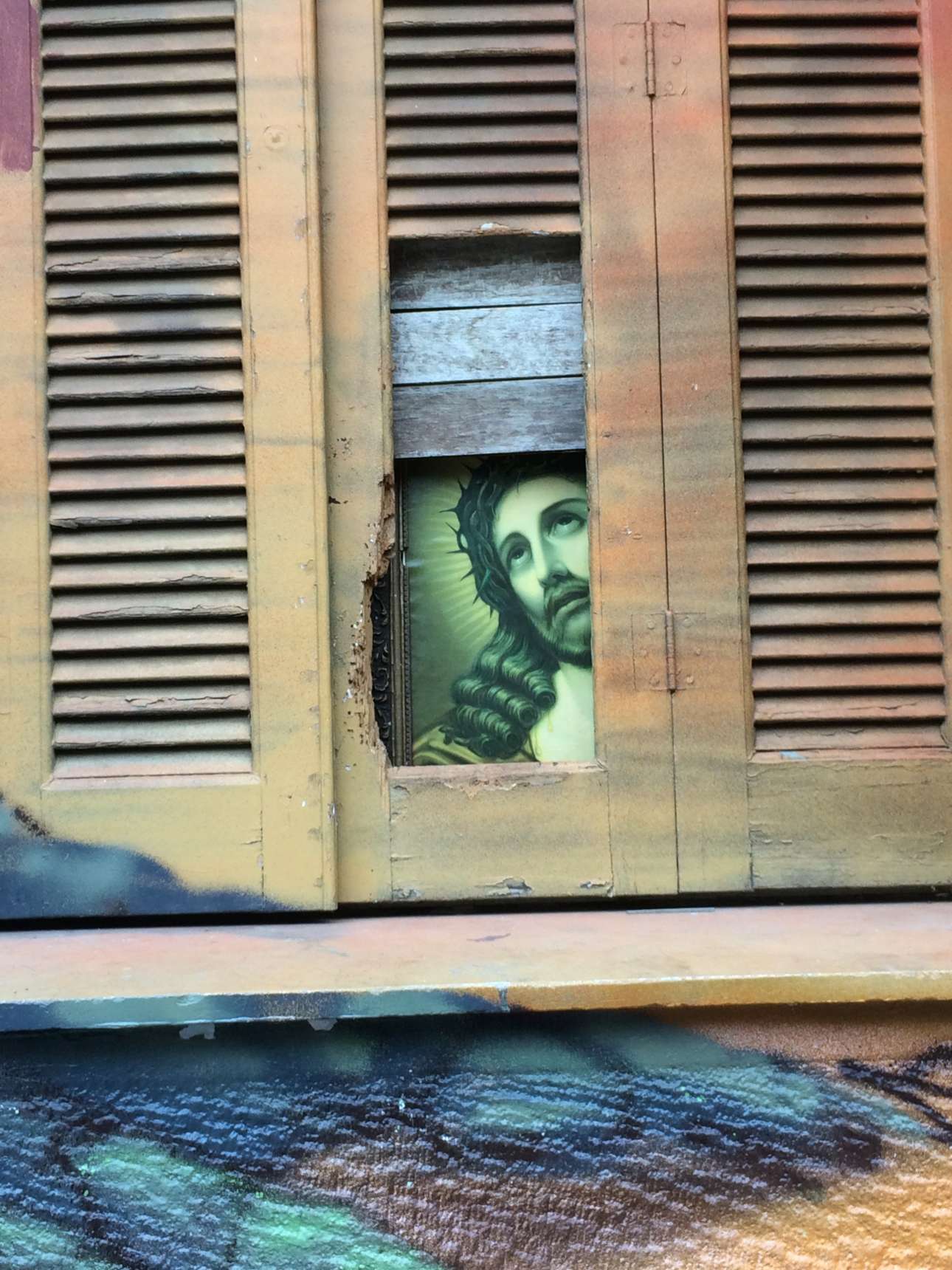 Ακαδημία Πλάτωνος, Αθήνα: Ο στέφανος εξ ακανθών προβάλλει πίσω από ένα παντζούρι, πάνω από τα γκράφιτι