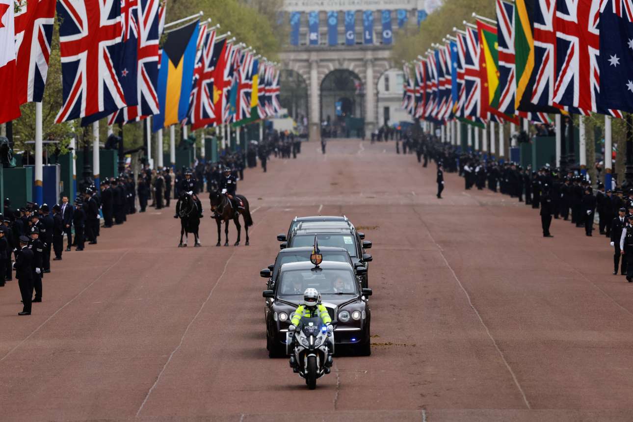 Το κομβόι που μεταφέρει τον βασιλιά Κάρολο Γ' και την βασίλισσα Καμίλα στην τελετή
