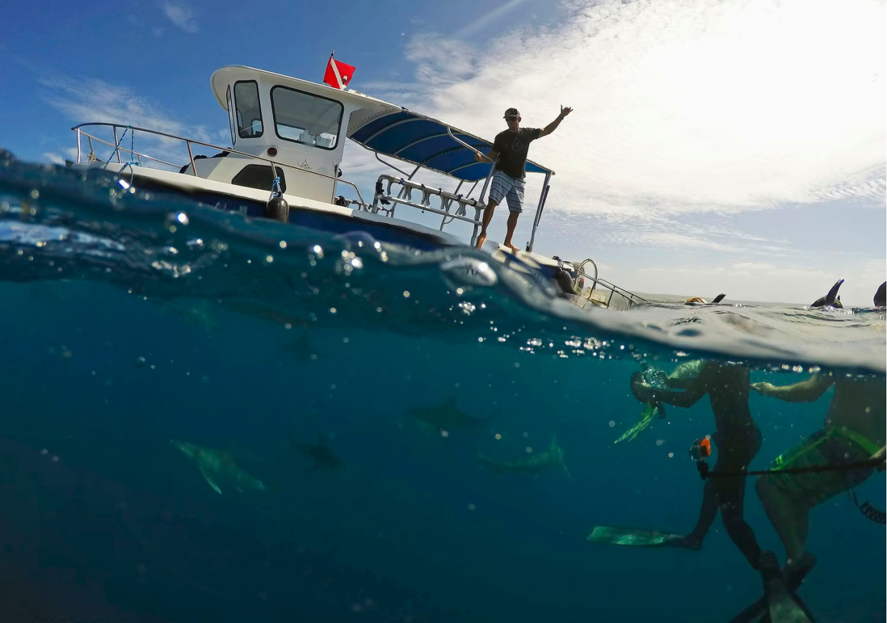 Ο καπετάνιος ενός σκάφους προειδοποιεί τους τουρίστες που κολυμπούν ότι τους πλησιάζουν πολλοί καρχαρίες, κατά τη διάρκεια μιας περιήγησης χωρίς κλουβιά σε θαλάσσια περιοχή όπου υπάρχουν καρχαρίες, στη Χάλεϊουα της Χαβάης, στις 16 Φεβρουαρίου 2015