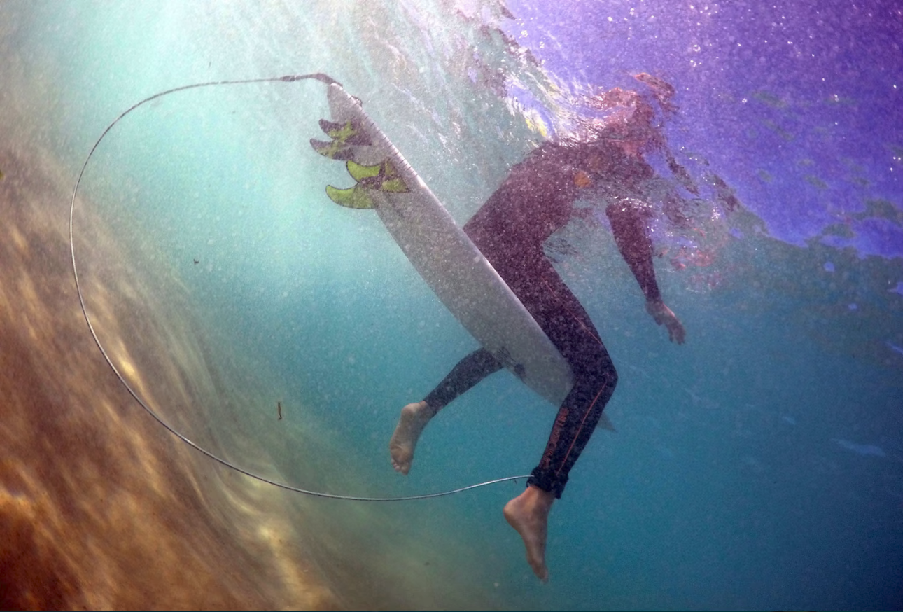 Υποβρύχια φωτογραφία του σέρφερ Αρλεν ΜακΦέρσον να κάθεται στη σανίδα του, στην οποία είναι ενσωματωμένη μια ηλεκτρονική συσκευή απώθησης καρχαριών, στην παραλία Μπόντι του Σίδνεϊ, στην Αυστραλία, στις 18 Αυγούστου 2015