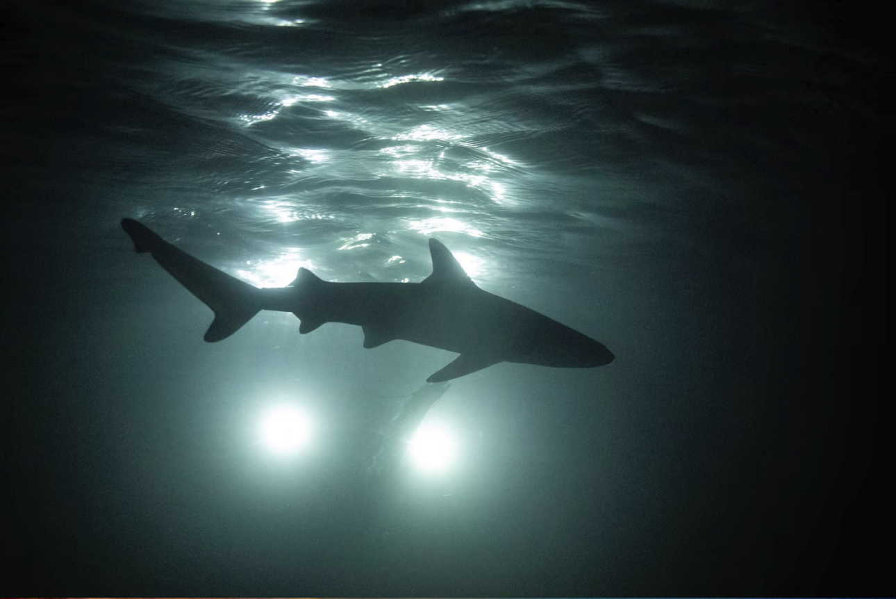 Η σκιά ενός νεογέννητου μαυροπτέρυγου καρχαρία των υφάλων φαίνεται καθώς κολυμπά τη νύχτα πέρα από τον απομακρυσμένο υποβρύχιο σταθμό βίντεο του «Maya Shark Watch Project», στον κόλπο Μάγια του Εθνικού Πάρκου Phi Phi Island, στο νησί Φι Φι Λε της Ταϊλάνδης, στις 27 Φεβρουαρίου 2023. Ο αριθμός των καρχαριών αυτού του είδους που περιφέρονται στη Θάλασσα Ανταμάν και σε άλλες τροπικές περιοχές μειώνεται λόγω της υπεραλίευσης, σύμφωνα με τη Διεθνή Ενωση για τη Διατήρηση της Φύσης