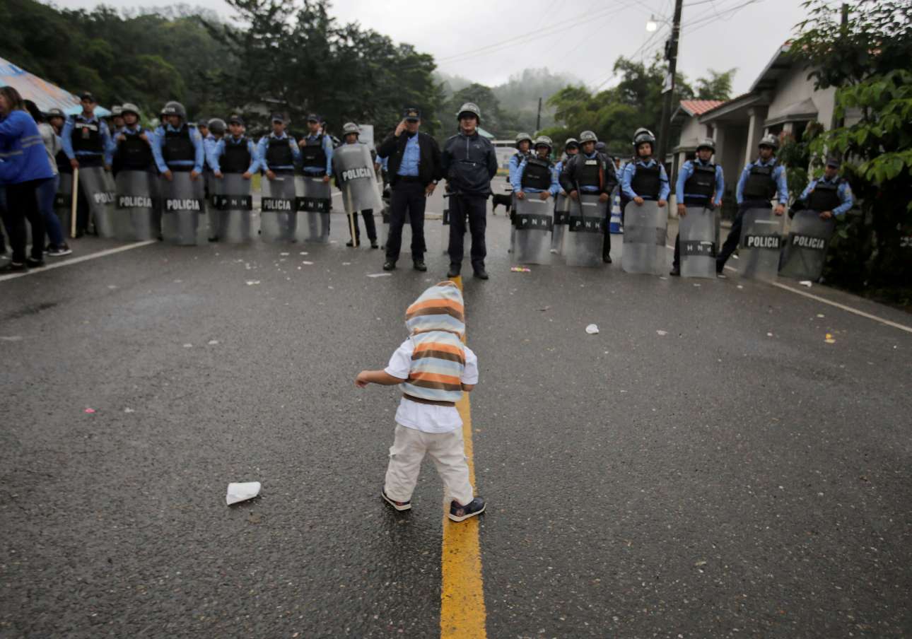 Πέμπτη, 18 Οκτωβρίου, Ονδούρα. Ενα παιδί που ταξιδεύει με τους γονείς του με σκοπό να εισέλθουν στις ΗΠΑ, στέκεται μόνο του μπροστά σε μπλόκο αστυνομικών δυνάμεων στην περιοχή Agua Caliente