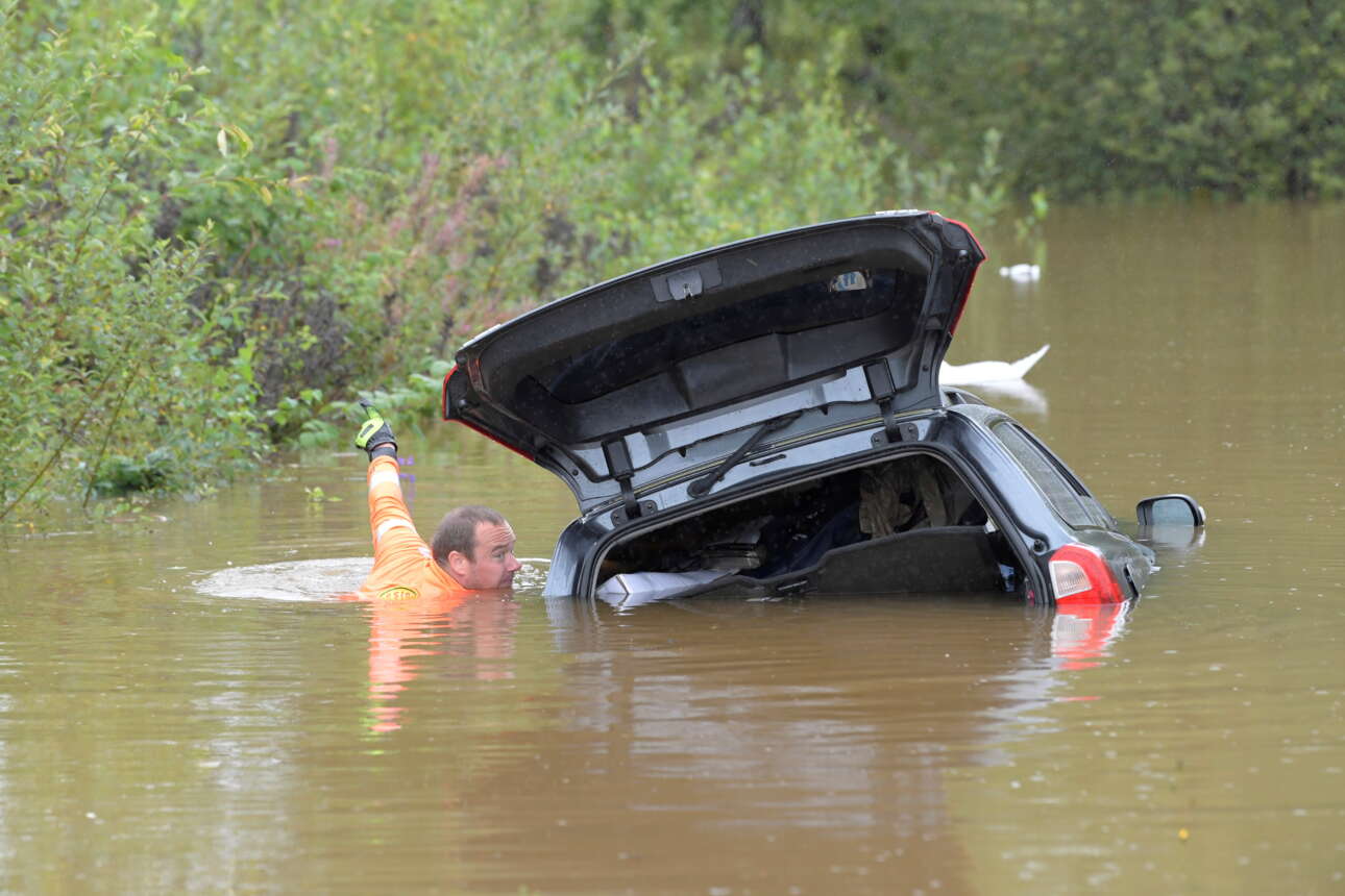 Διασώστης προσεγγίζει ένα αυτοκίνητο που έχει παρασυρθεί από τα νερά κατά τη διάρκεια πλημμύρας στην περιοχή Φαλούν της Σουηδίας