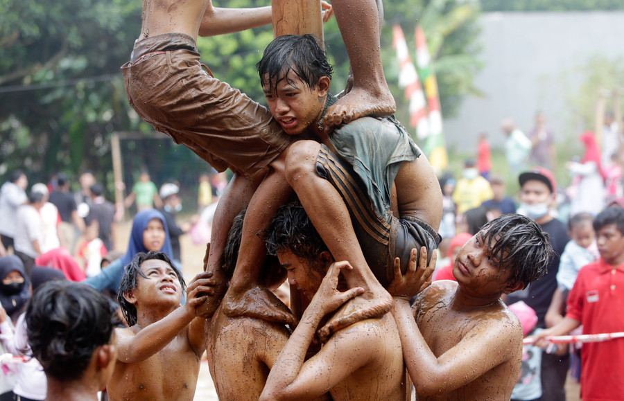Πιτσιρικάδες από την Ινδονησία συμμετέχουν σε διαγωνισμό αναρρίχησης φοίνικα στο Ντεπόκ. Με αυτόν τον τρόπο σηματοδοτούν την 76η επέτειο της ανεξαρτησίας της χώρας από την Ολλανδία