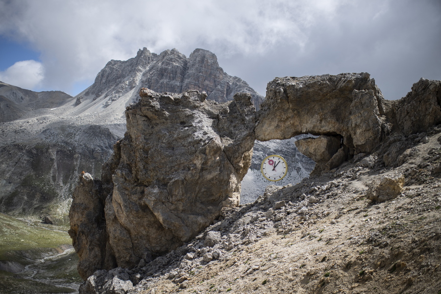Αποψη της εγκατάστασης «Und Endlich» των γερμανών καλλιτεχνών Βόλφγκανγκ Άιχνερ και Τόμας Χούμπε στο πέρασμα Fuorcla digl Leget στο Μπίβιο της Ελβετίας. Το έργο τέχνης που φαίνεται είναι ένα ρολόι το οποίο επιβραδύνει καθώς πλησιάζουν οι θεατές μέχρι που οι δείκτες του σταματούν