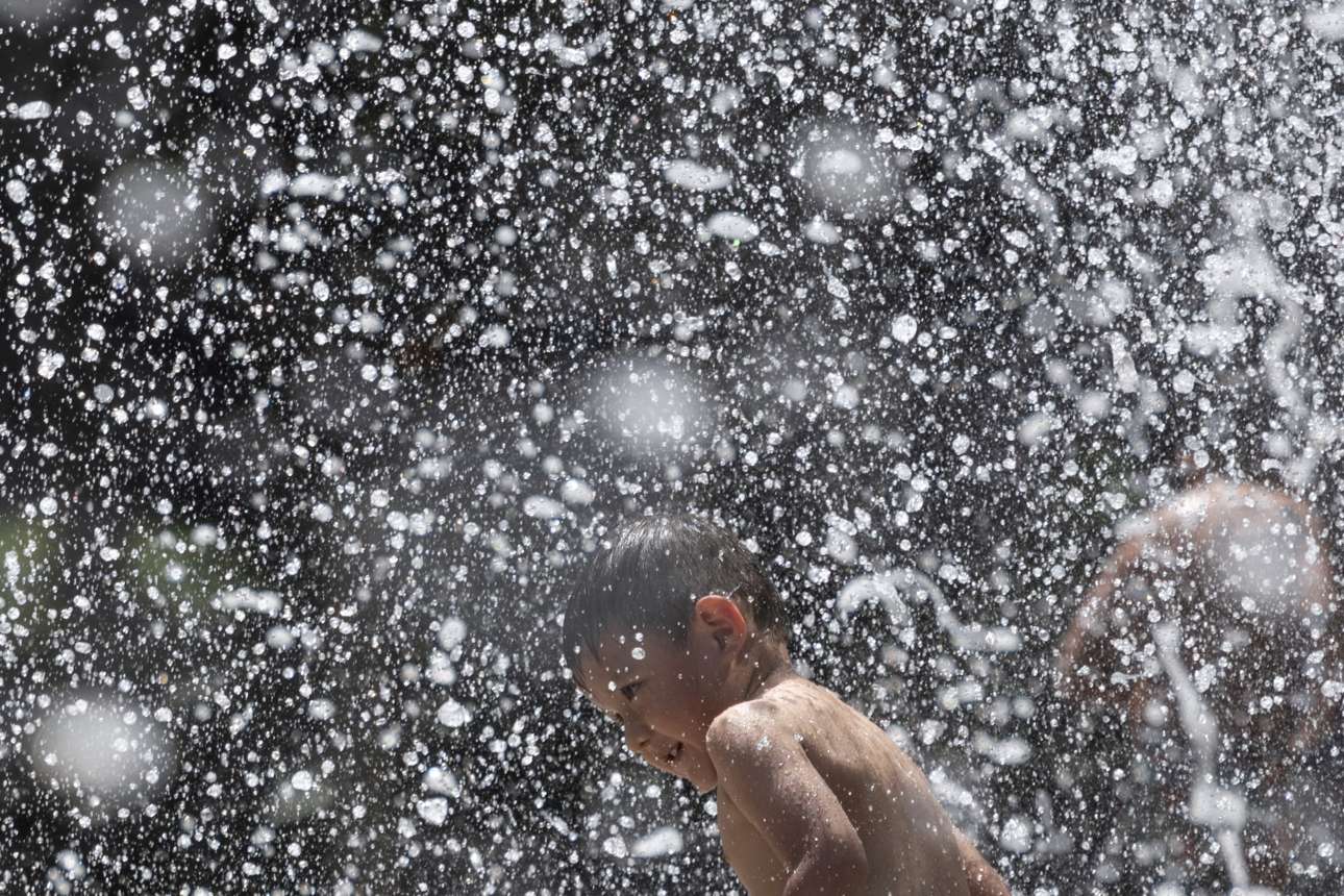 Χαμογελαστό αγόρι μέσα σε σύννεφο δροσοσταλίδων: η φρεσκάδα της σάρκας και της ψυχής αποτυπωμένη σε ένα καρέ που υμνεί το ανακουφιστικό παιχνίδι με το νερό – στο Χιούστον του Τέξας καραδοκούσε ο φωτογράφος σαν ενεργούμενο του θείου Ιουλίου