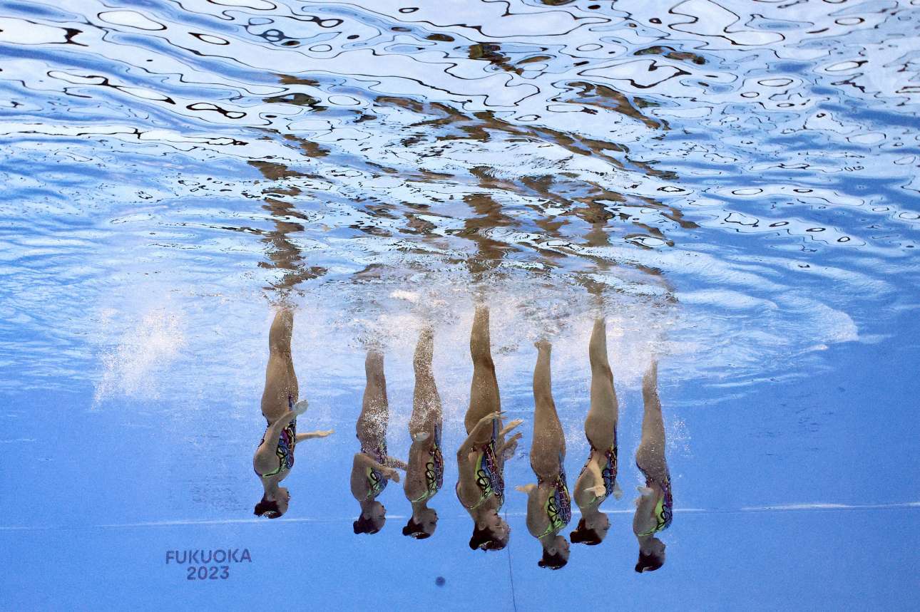 Τα κορίτσια της ελληνικής ομάδας καλλιτεχνικής κολύμβησης εκτελούν το πρόγραμμά τους στο Παγκόσμιο Πρωτάθλημα Υγρού Στίβου της Φουκουόκα, στην Ιαπωνία – η ανάποδη θέαση του κόσμου και από τον πάτο της πισίνας είναι οπωσδήποτε προσωρινή