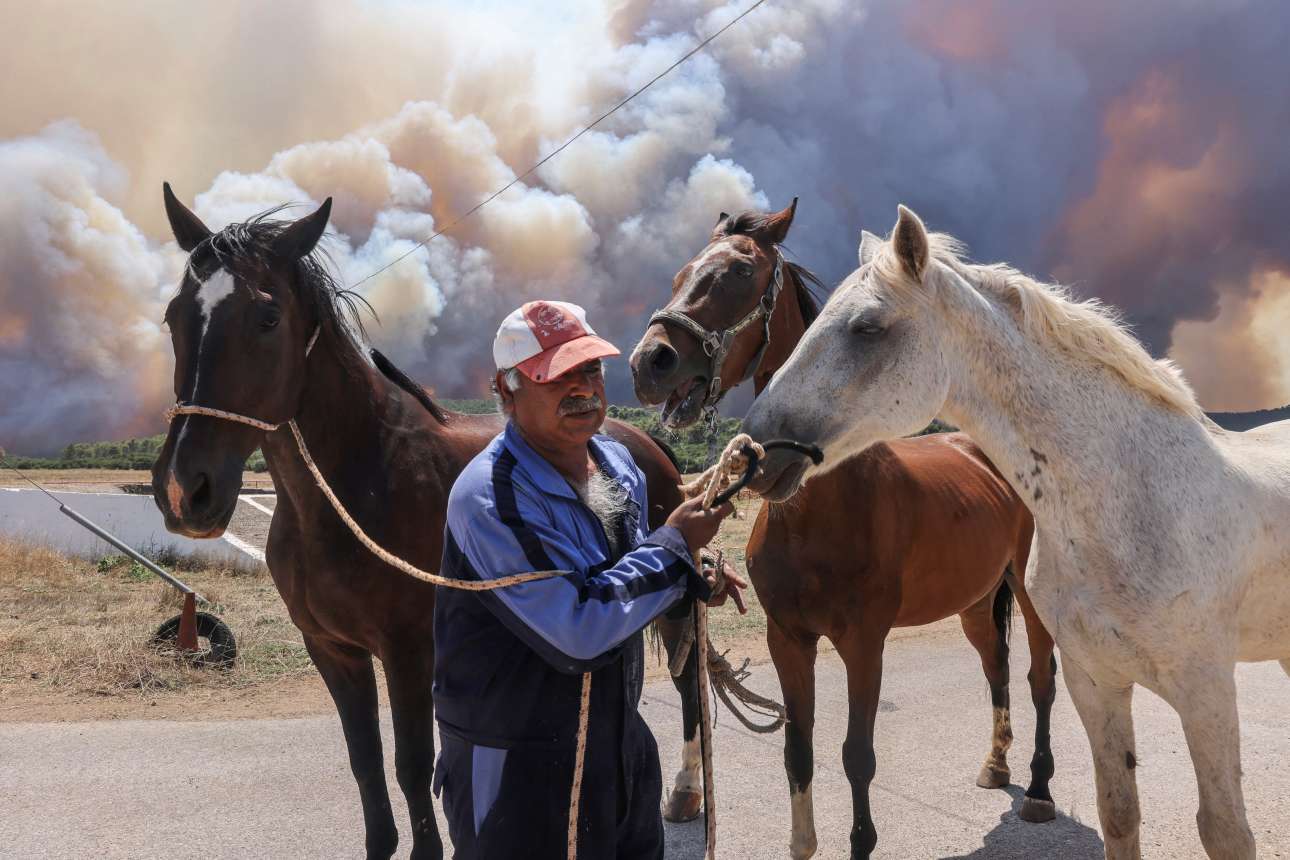 Σκηνή από το χωριό Πουρνάρι της Οινόης: τρία άλογα, ανήσυχα και φοβισμένα, απομακρύνονται από τον στάβλο, καθώς η πυρκαγιά πλησιάζει – καρέ της 18ης Ιουλίου, ημέρας αγωνίας και πίκρας για τους ντόπιους αλλά και άγχους για τη «μισή Ελλάδα» της Αττικής