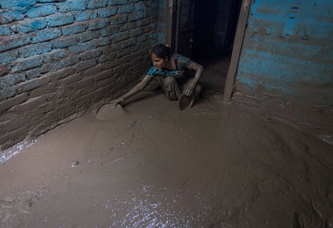 Την κυρία Μούνι Ντέβι, 28 σκληραγωγημένων Μαΐων, κάτοικο Νέου Δελχί, ο φακός την απαθανάτισε με δύο τσίγκινα πιάτα ανά χείρας να παιδεύεται για να καθαρίσει από τις λάσπες το φτωχικό της – τη ζημιά την έκανε ο ποταμός Γιαμούνα που φούσκωσε από τον μουσώνα, θύμωσε και, ντιπ χαζός όπως είναι, ξέσπασε στα λαϊκά κατώφλια