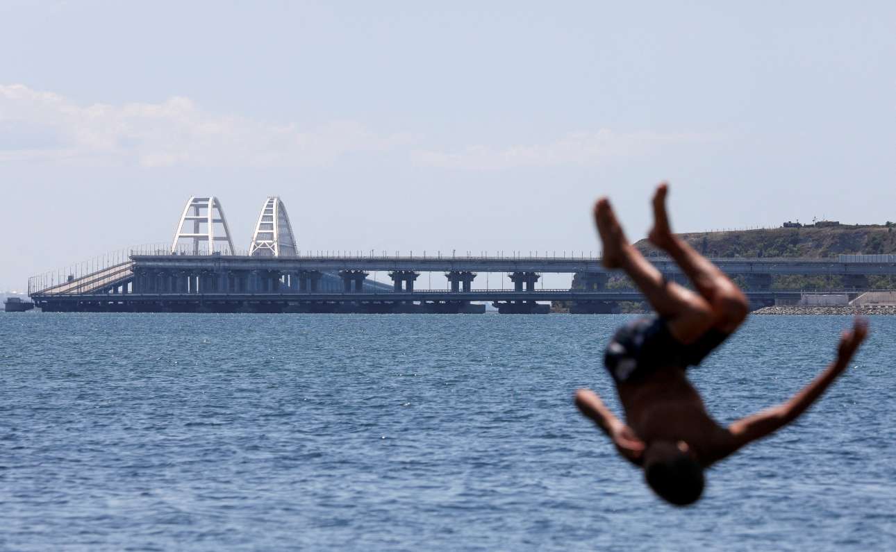 Η νέα επίθεση εναντίον της γέφυρας της Κριμαίας δεν φαίνεται να πτοεί τον νεαρό που πέφτει στο νερό με περίτεχνη τούμπα – καρέ από το Κερτς, που επιβεβαιώνει ότι σε κάποιες ηλικίες το καλοκαίρι δρα καταλυτικά, λιώνει, εξαϋλώνει και απορροφά κάθε άλλη προτεραιότητα, διαλύει με μια βουτιά κάθε πόθο, άγχος ή φόβο