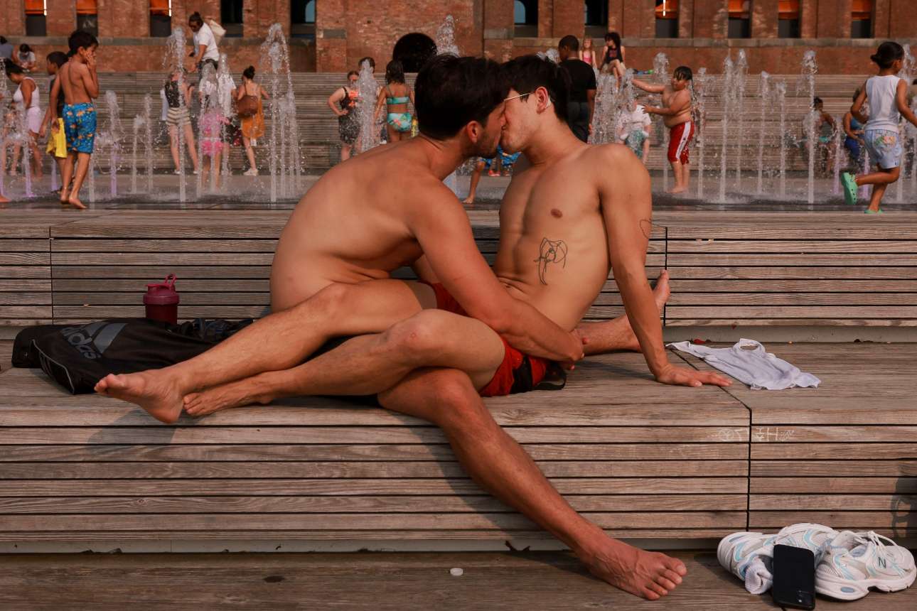 Δύο άνδρες με μαγιό φιλιούνται περιπαθώς και δημοσίως «καθώς παιδάκια παίζουν στους πίδακες του πάρκου Domino στο Μπρούκλιν της Νέας Υόρκης» – ο λεζαντογράφος του πρακτορείου έκανε τη δουλειά του, παρέλειψε όμως να εκθειάσει τα πιτσιρίκια για την ώριμη διακριτικότητά τους, αφού κανένα δεν κοιτάζει προς τη μεριά των κυρίων