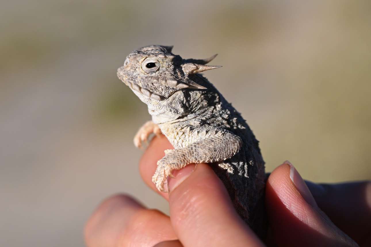 Είδος υπό εξαφάνιση η κερασφόρος σαύρα, και μάλιστα σε σημαδιακό μέρος: το καρέ τραβήχτηκε λίγο πριν από την απελευθέρωσή της στην Καλιφόρνια, στην τοποθεσία Καλαμποκοχώραφο του Διαβόλου, κάπου στην Κοιλάδα του Θανάτου – οι αλαφροΐσκιωτοι ας προσπεράσουν ταχέως