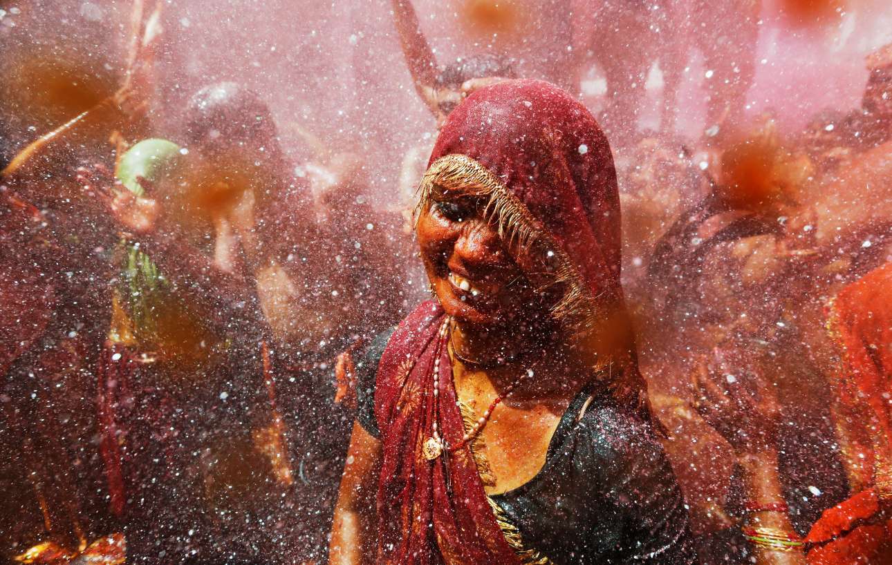 Σάββατο, 23 Μαρτίου, Ινδία. Νεαρή κοπέλα στο ναό Dauji της πόλης Mατούρα συμμετέχει στο παιχνίδι «Huranga». Πρόκειται για ένα παιχνίδι μεταξύ ανδρών και γυναικών που λαμβάνει χώρα μία μέρα μετά το Φεστιβάλ Χόλι (γνωστό και ως «Γιορτή των Χρωμάτων»)