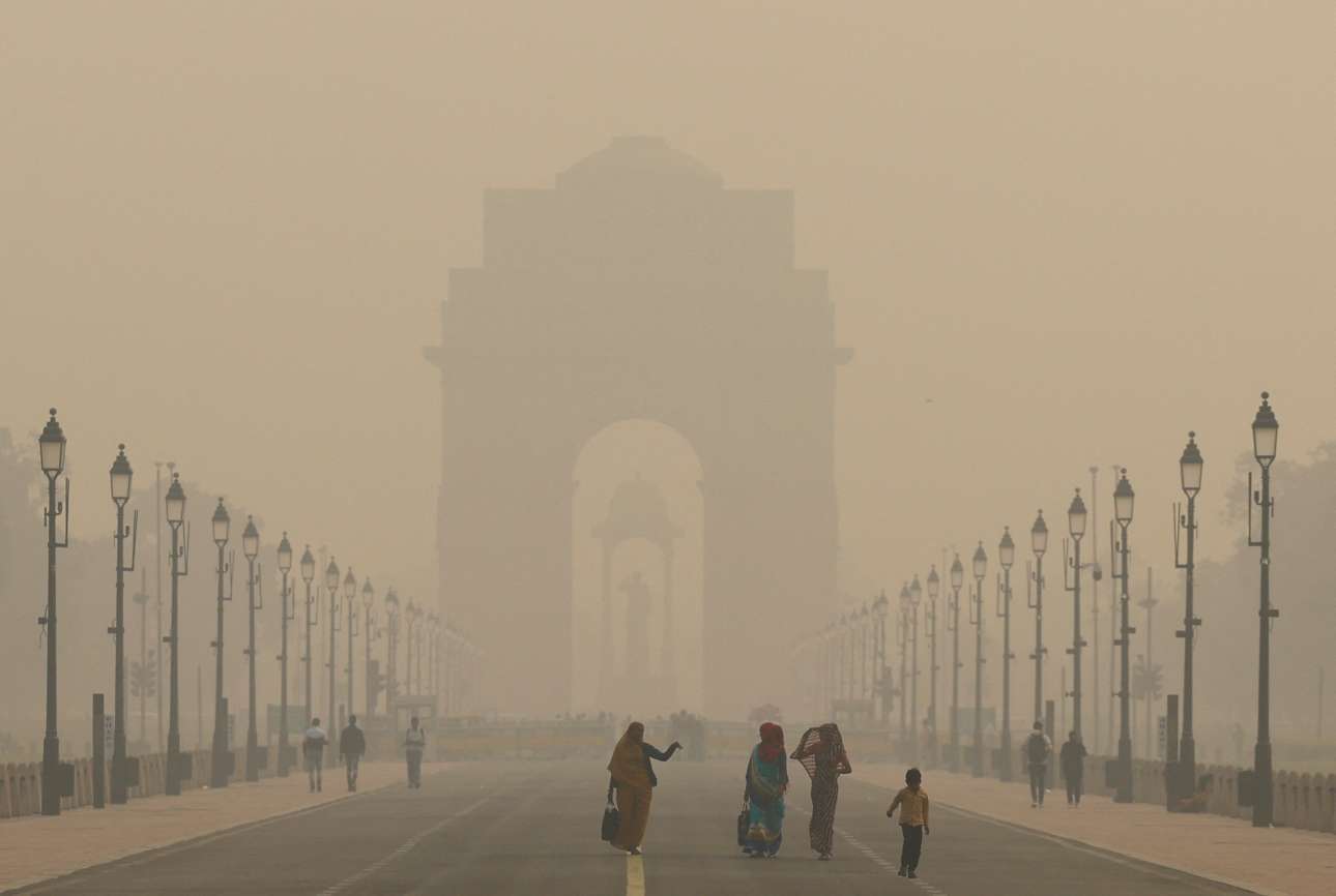 Ανθρωποι περπατούν σε δρόμο κοντά στην Πύλη της Ινδίας, με τον ουρανό να κρύβεται από πυκνό νέφος, μετά την επιδείνωση της ποιότητας του αέρα στο Νέο Δελχί εξαιτίας της ατμοσφαιρικής ρύπανσης