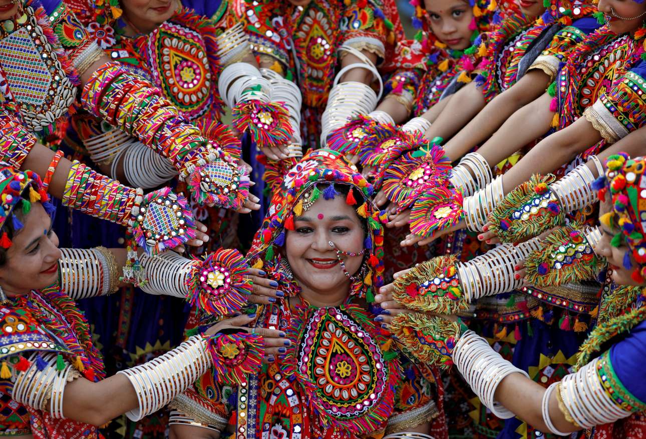 Κοπέλες στην πόλη Αχμπανταμπάντ της Ινδίας ποζάρουν για φωτογραφία κατά τη διάρκεια πρόβας για τον παραδοσιακό χορό Garba