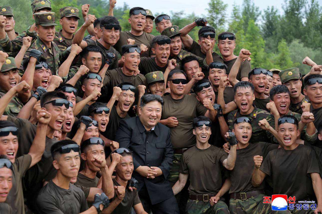 Ο δικτάτορας της Βόρειας Κορέας, Κιμ Γιονγκ Ουν (στο μέσον), ποζάρει χαμογελαστός ανάμεσα σε στρατιώτες -επίσης Βορειοκορεάτες, εννοείται, και επίσης περιχαρείς- σε φωτογραφία που, ως είθισται, δημοσιοποίησε το απομονωμένο καθεστώς