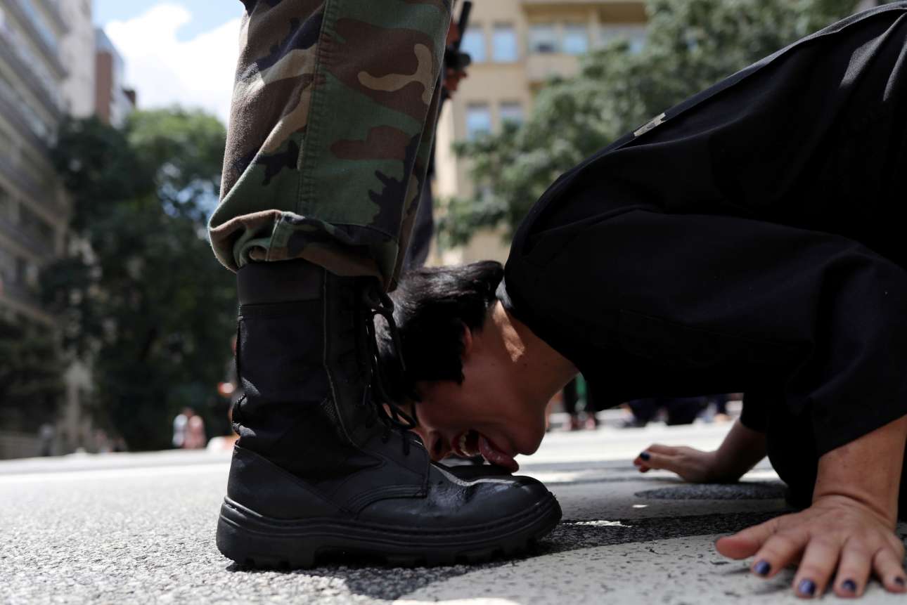 Δευτέρα, 25 Μαρτίου, Βραζιλία. Η καλλιτέχνιδα Ντεμπόρα Καστίγιο γλείφει τις μπότες ενός άνδρα ντυμένου με στρατιωτική στολή κατά τη διάρκεια της περφόμανς «"Lamebrasil, Lamezuela - questioning power in Latin America» στο Σάο Πάολο