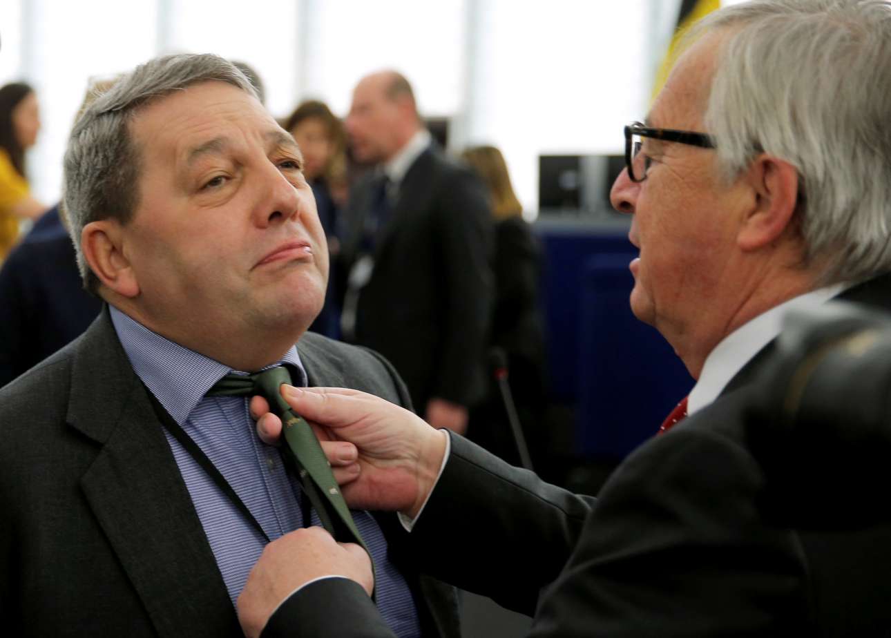 Τετάρτη, 27 Μαρτίου, Γαλλία. Ο πρόεδρος της Ευρωπαϊκής Επιτροπής Ζαν-Κλοντ Γιούνκερ διορθώνει τη γραβάτα του ευρωβουλευτή Ντέιβιντ Κόμπερν λίγο πριν από την έναρξη της Ευρωπαϊκής Συνόδου για το Brexit στο Ευρωπαϊκό Κοινοβούλιο, στο Στρασβούργο