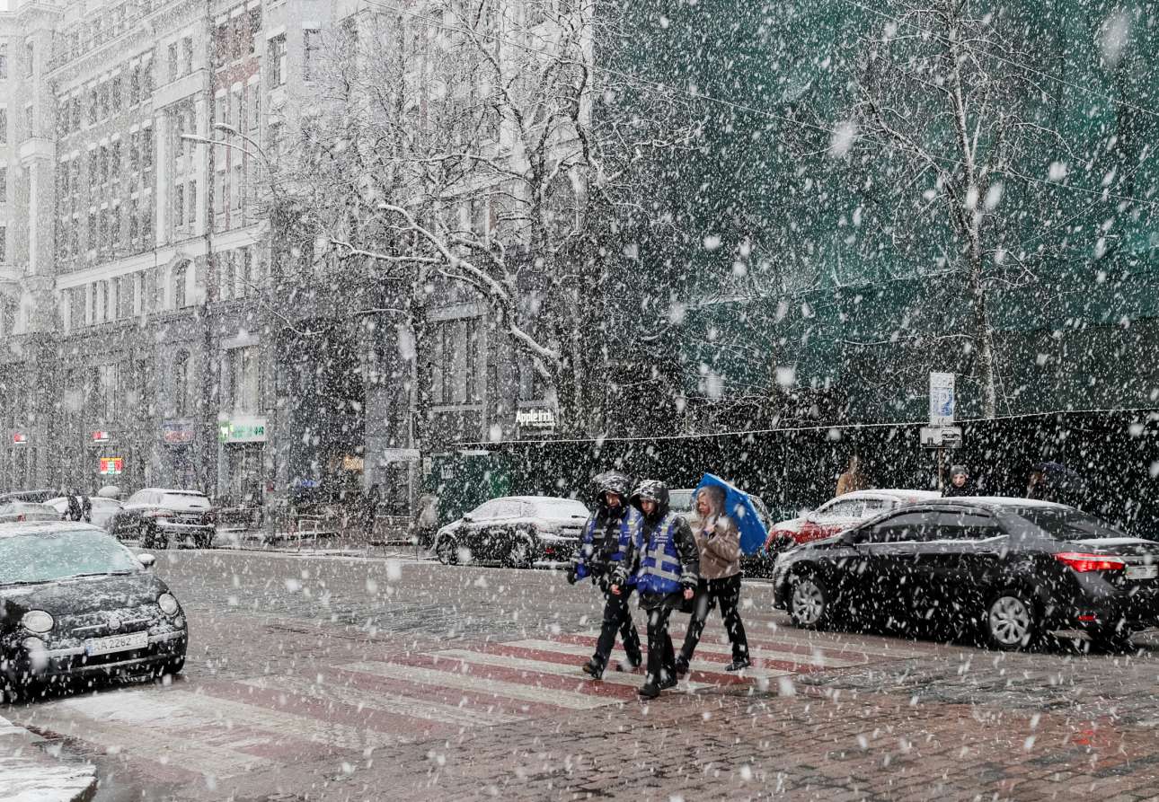 Τετάρτη, 27 Μαρτίου, Ουκρανία. Κόσμος περπατάει στο κέντρο του Κιέβου εν μέσω σφοδρής χιονόπτωσης
