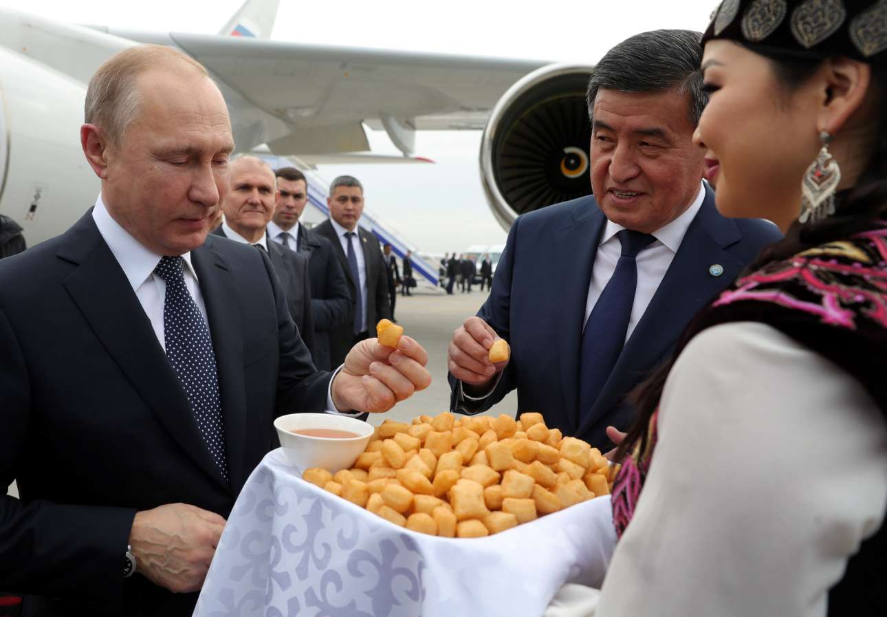 Πέμπτη, 28 Μαρτίου, Κιργιστάν. Ο πρόεδρος της Κιργιζίας Σοορονμπάι Τζεενμπέκοφ υποδέχεται το ρώσο πρόεδρο Βλαντίμιρ Πούτιν στο αεροδρόμιο του Μπισκέκ και τον κερνάει μια τοπική λιχουδιά