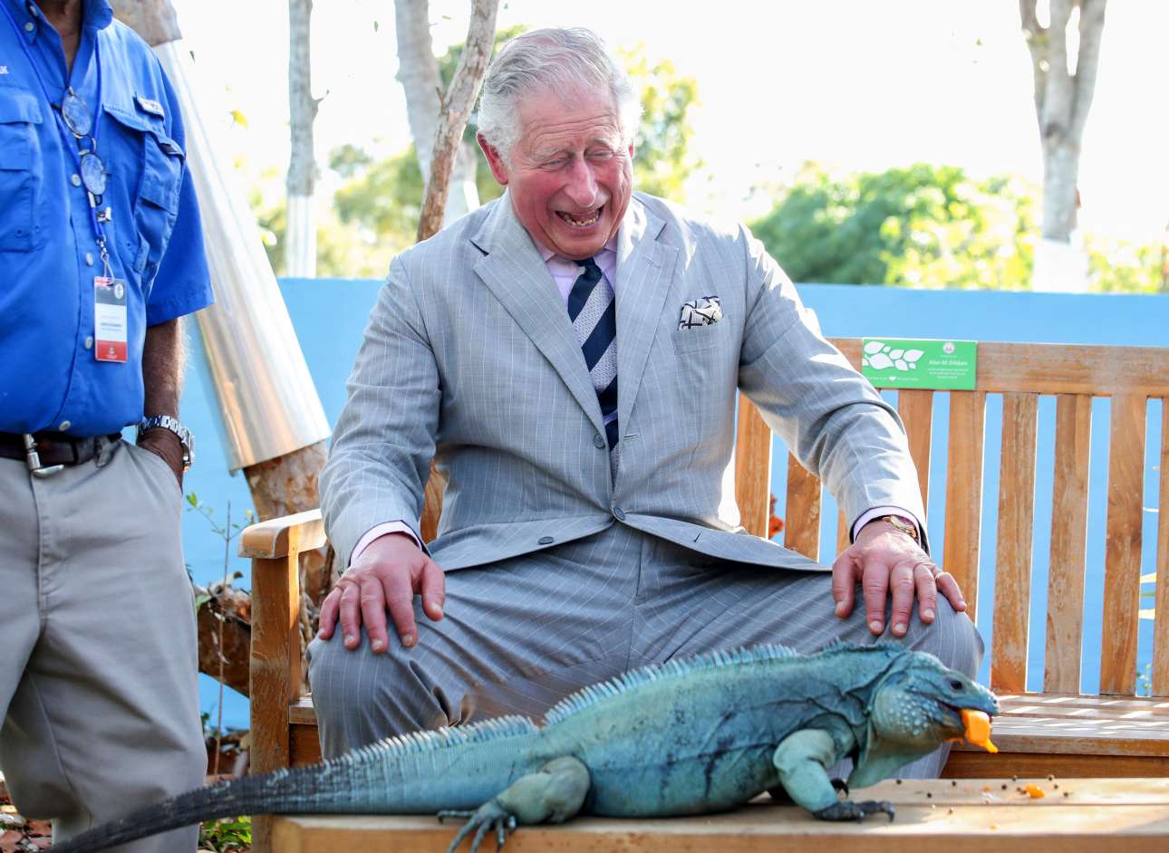 Παρασκευή, 29 Μαρτίου, Νησιά Κέιμαν. O πρίγκιπας Κάρολος διασκεδάζει βλέποντας από κοντά ένα μπλε ιγκουάνα σε πάρκο στο Γκραντ Κέιμαν