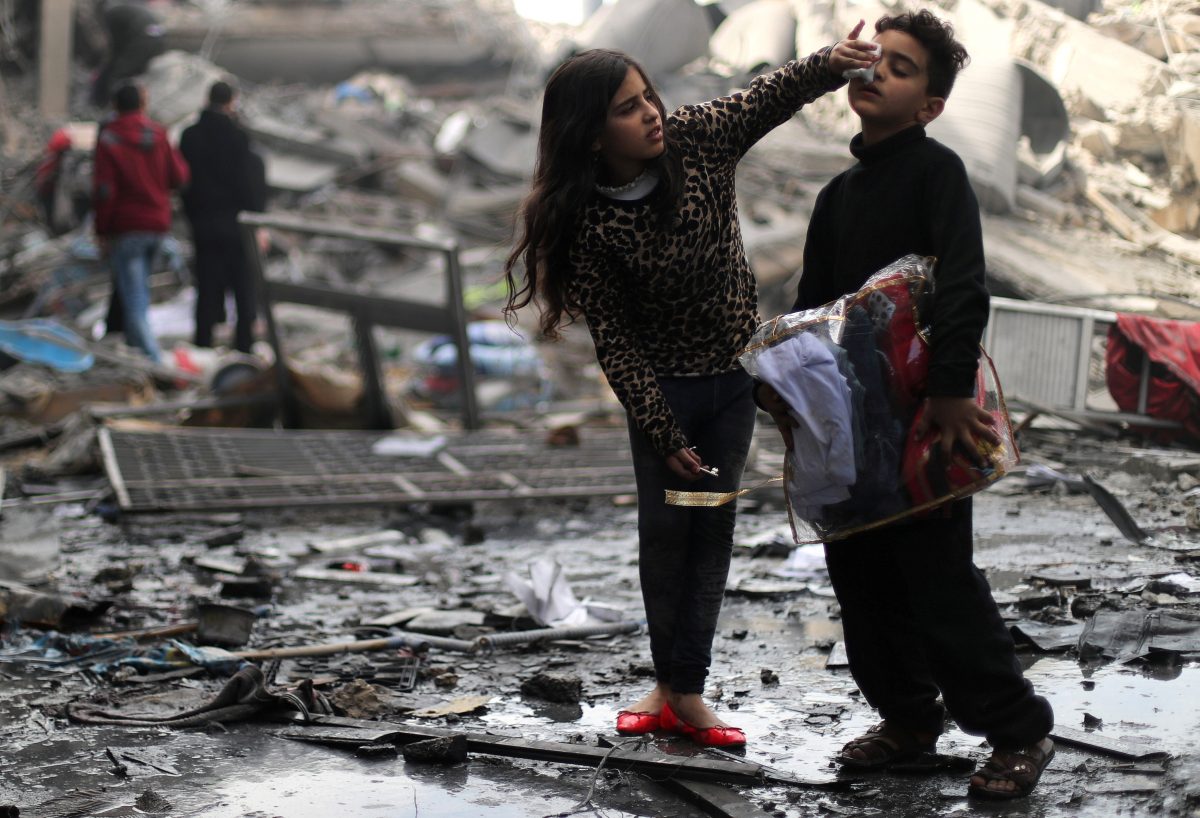 Τρίτη, 26 Μαρτίου, Γάζα. Μία μικρή Παλαιστίνια βοηθάει τον αδερφό της που έχει τραυματιστεί ελαφρά έξω από το κατεστραμμένο από ισραηλινά πλήγματα σπίτι τους