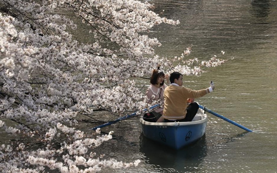 Τρίτη, 26 Μαρτίου, Ιαπωνία. Ζευγάρι κάνει βαρκάδα απολαμβάνοντας τις ανθισμένες κερασιές στο πάρκο Chidorigafuchi Moat, στο Τόκιο