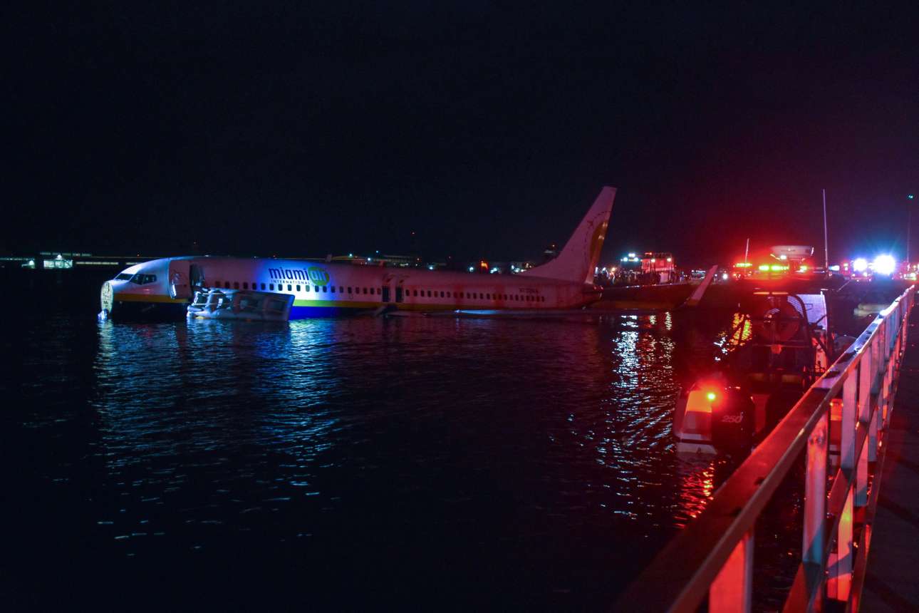 Σάββατο 3 Μαΐου. Το αεροπλάνο Boeing 737 της εταιρείας Miami Air, στα ρηχά του παρακείμενου ποταμού στο αεροδρόμιο της Τζάκσονβιλ στη Φλόριντα, όπου κατέληξε αφού γλίστρησε έξω από τον διάδρομο προσγειώσεως