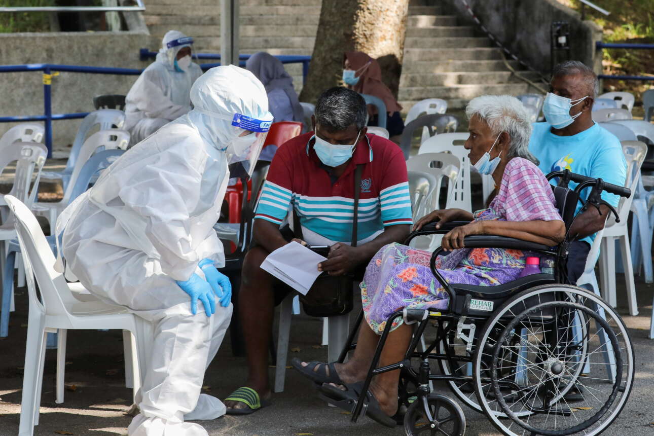 Νοσηλευτής με προστατευτικό εξοπλισμό μιλάει με μία ηλικιωμένη έξω από κέντρο υγείας για ασθενείς με κορονοϊό, στο Σα Αλάμ της Μαλαισίας