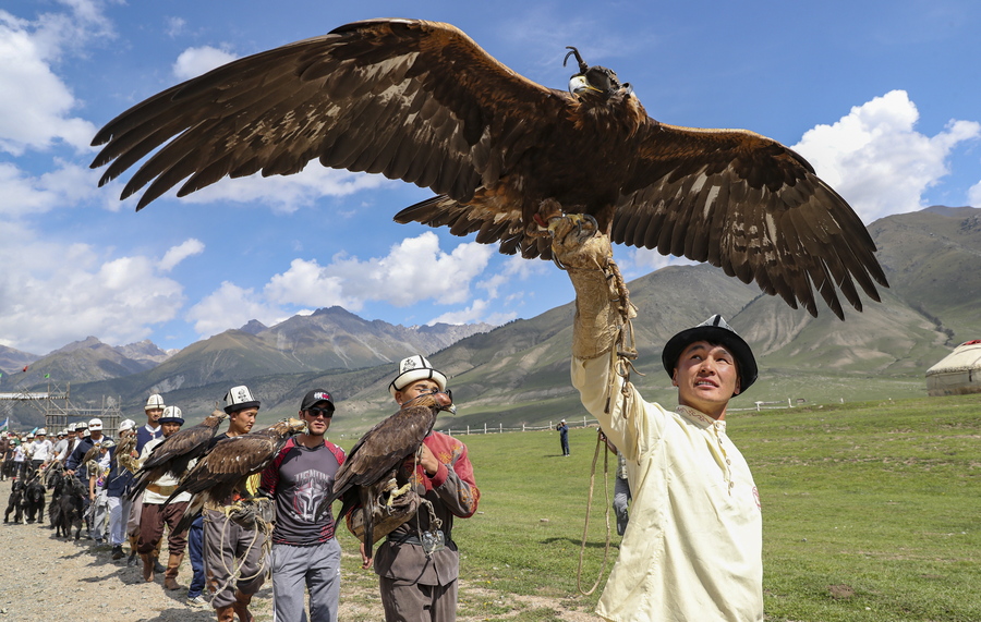 Κυνηγοί αετών που κρατούν χρυσαετούς, κατά τη διάρκεια εθνικού φεστιβάλ κυνηγιού στο φαράγγι του Κίρχιν, 350 χιλιόμετρα από την πρωτεύουσα του Κιργιστάν, Μπίσκεκ