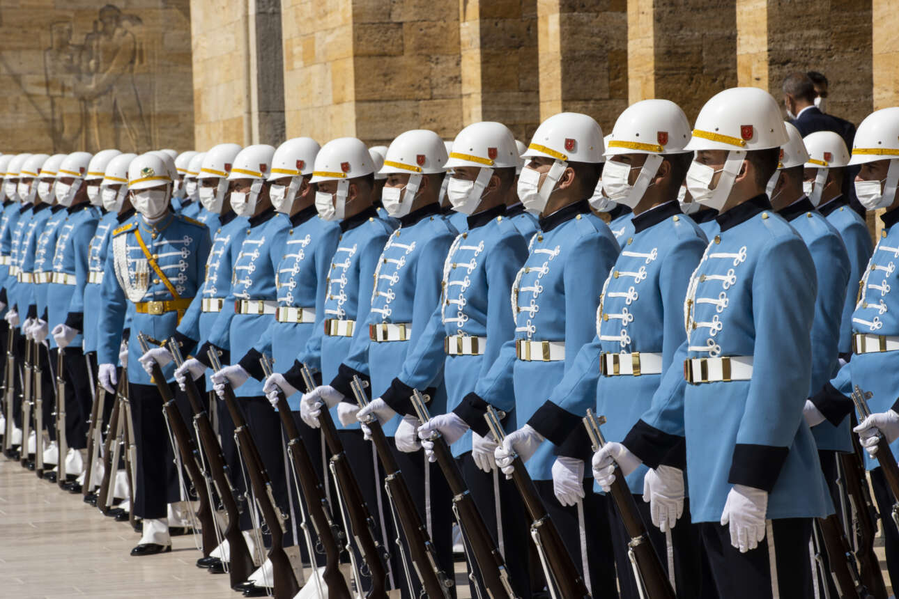 Φρουροί που φορούν μάσκες στο Ανιτκαμπίρ, μαυσωλείο της Τουρκίας, παρατάσσονται σύμφωνα με τους κανόνες κοινωνικής αποστασιοποίησης για τον εορτασμό της 99ης επετείου της «Ημέρας της Νίκης». Η «Ημέρα της Νίκης» είναι μια από τις σημαντικότερες εθνικές γιορτές στην Τουρκία με την οποία τιμάται η νίκη του τουρκικού στρατού επί των ελληνικών δυνάμεων, στη μάχη που διεξήχθη στις 30 Αυγούστου του 1922 στο Ντουμπλουπινάρ, κοντά στο Αφιόν Καραχισάρ