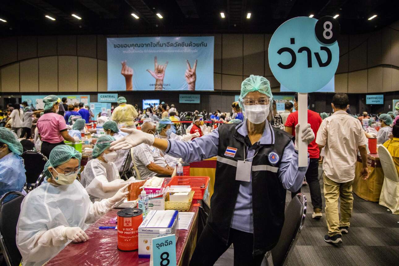 Εθελόντρια νοσοκόμα καλεί τον επόμενο ασθενή για να κάνει το εμβόλιο της Pfizer στο εμπορικό κέντρο Westgate στην Μπανγκόκ της Ταϊλάνδης