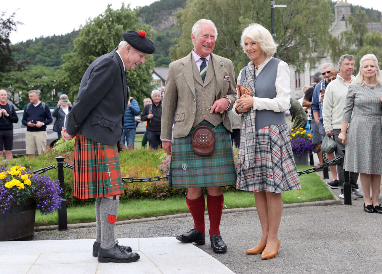Ο πρίγκιπας Κάρολος της Ουαλίας ντυμένος με την παραδοσιακή φορεσιά και η δούκισσα της Κορνουάλης Καμίλα, μιλούν με τον 90χρονο Χιού Ινκστερ κατά την επίσκεψή τους στο χωριό Μπάλατερ της Σκωτίας