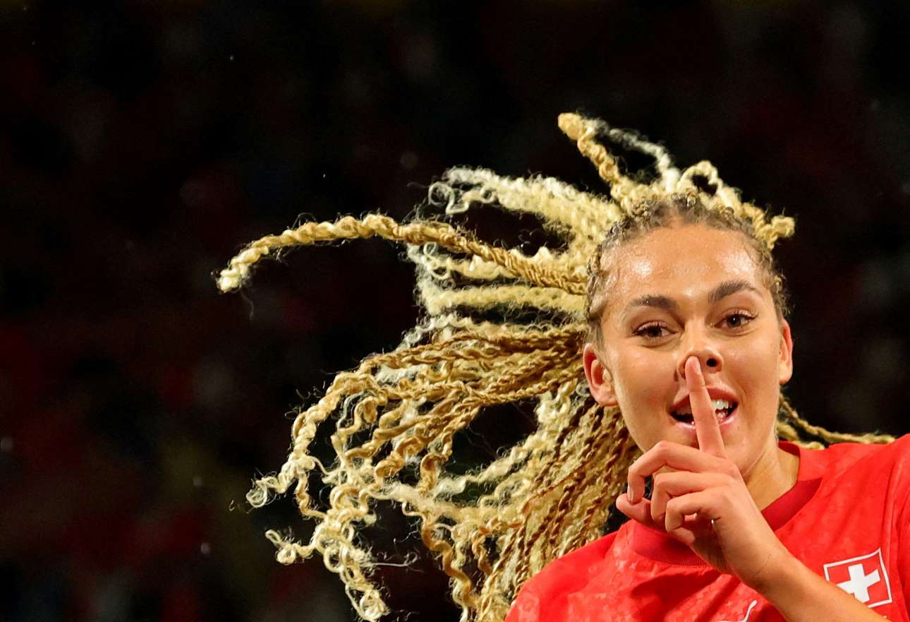 Η Ελβετίδα Alayah Pilgrim έχει μόλις σκοράρει το δεύτερο γκολ της (γηπεδούχου) ομάδας της εναντίον της Ισλανδίας, στο πλαίσιο του Ευρωπαϊκού Πρωταθλήματος Ποδοσφαίρου (Euro) Γυναικών 2025, και τα πανηγυρίζει... μαζί με τις ακαταμάχητες κοτσίδες της
