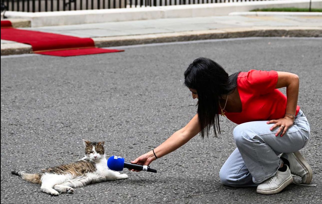 Η ρεπόρτερ μπορεί να κάνει «απλώς της δουλειά της» τείνοντας το μικρόφωνο στον Λάρι, τον διάσημο γάτο της πρωθυπουργικής κατοικίας στην Ντάουνινγκ Στριτ του Λονδίνου -επρόκειτο για την ημέρα που συναντήθηκαν εκεί το ζεύγος Στάρμερ με το ζεύγος Μακρόν-, ωστόσο αυτός δεν δείχνει πρόθυμος να προσφέρει «καυτό» ρεπορτάζ